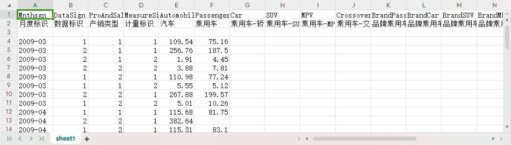 月度标识 数据标识 产销类型 计量标识 汽车 乘用车 乘用车-轿车 乘用车-SUV 乘用车-MPV 乘用车-交叉型 品牌乘用车 品牌乘用车-轿车 品牌乘用车-SUV 品牌乘用车-MPV 商用车 商用车-货车 商用车-客车 新能源汽车 新能源汽车-纯电动汽车 新能源汽车-插电式混合动力汽车 新能源汽车-燃料电池汽车 单位
