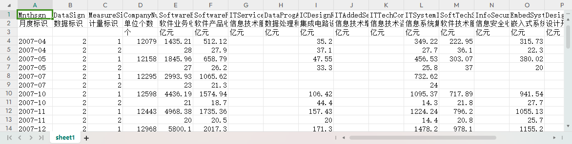 月度标识 数据标识 计量标识 单位个数 软件业务收入合计 软件产品收入 信息技术服务收入 数据处理和运营服务收入 集成电路设计收入 信息技术增值服务收入 信息技术咨询服务收入 信息系统集成和支持服务收入 软件技术服务收入 信息安全收入 嵌入式系统软件收入 设计开发收入 软件业务出口 利润总额 从业人员工资总额 从业人员平均人数