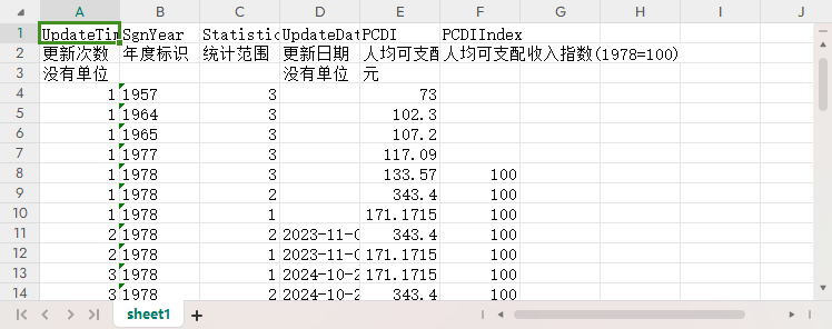 更新次数 年度标识 统计范围 更新日期 人均可支配收入绝对数 人均可支配收入指数(1978=100)