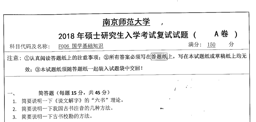 南师大南京师范大学考研复试真题国学基础知识2018(无答案)