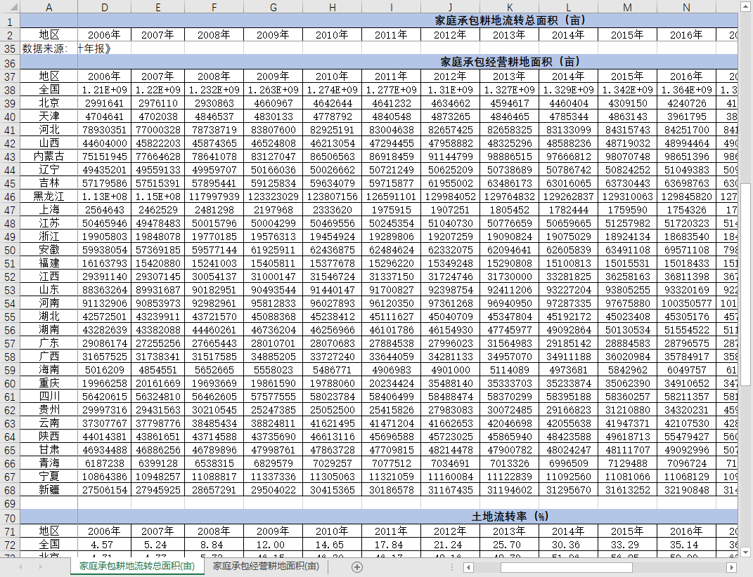 (仅全国及30个省份家庭承包耕地流转总面积经营耕地面积土地流转率2005-2022excel)