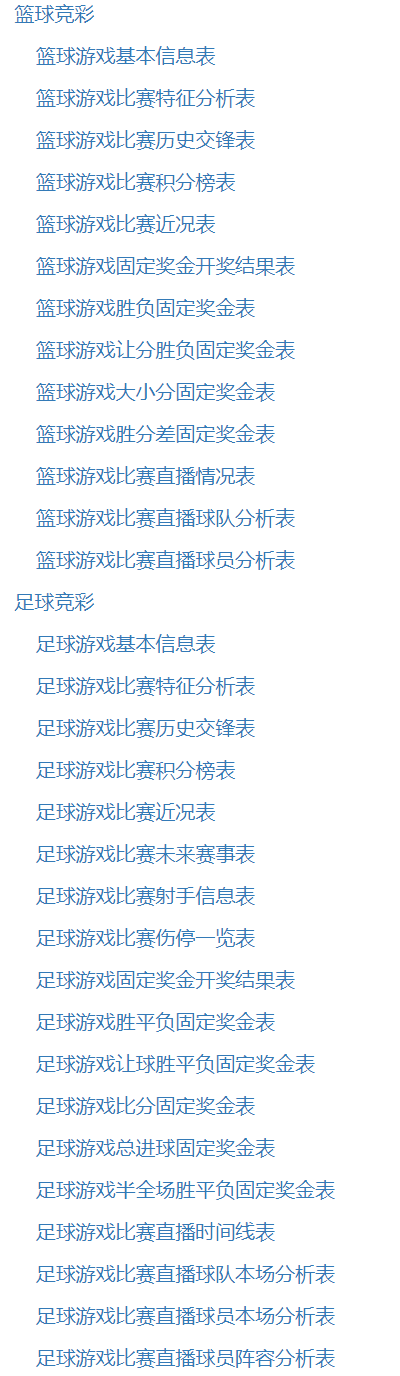 根据中国体育彩票官方来源,归结整理了篮球游戏和足球游戏,形成了中国篮球和足球体育彩票信息数据,包含游戏基本信息、比赛数据、固定奖金和比赛直播四个板块,涵盖比赛日期、客队、主队、得分、胜果、历史排名、球员等字段。