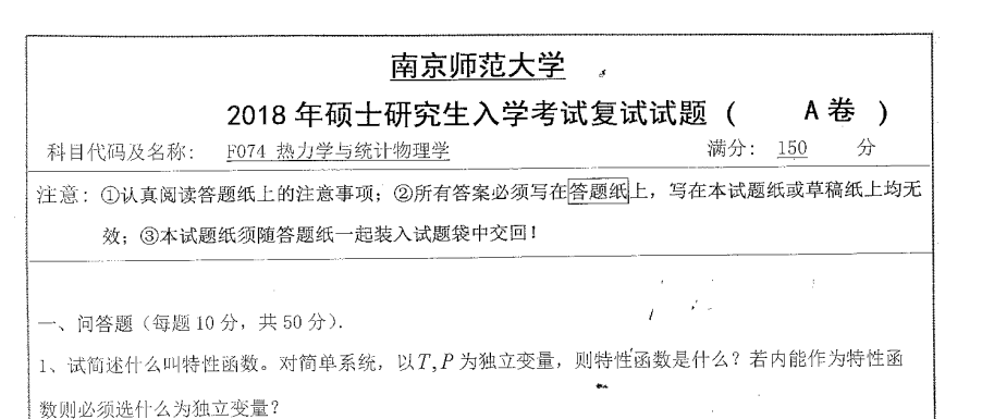 2018热力学与统计物理学南师大南京师范大学考研复试真题(无答案)