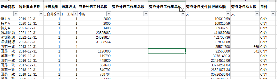 证券代码 、证券简称 、统计截止日期、报表类型、结算方式 、劳务外包工时总数、劳务外包工作量总数、 劳务外包工作量单位、务外包支付的报酬总额 、劳务外包总人数 、币种