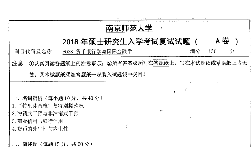 2018货币银行学与国际金融学南师大南京师范大学考研复试真题(无答案).pdf
