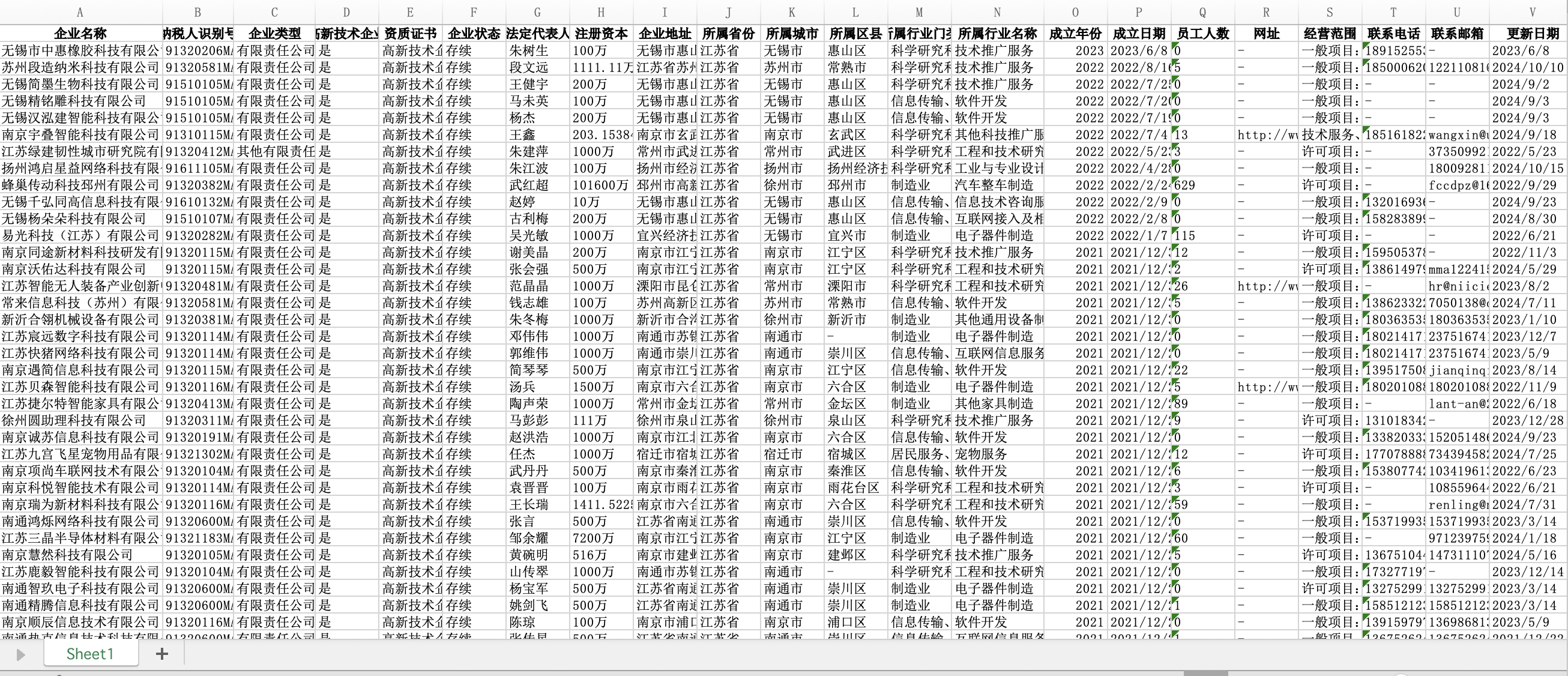 企业名称 | 纳税人识别号 | 企业类型 | 是否高新技术企业认定 | 资质证书 | 企业状态 | 法定代表人 | 注册资本 | 企业地址 | 所属省份 | 所属城市 | 所属区县 | 所属行业门类 | 所属行业名称 | 成立年份 | 成立日期 | 员工人数 | 网址 | 经营范围 | 联系电话 | 联系邮箱 | 更新日期