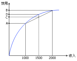 假如你获得了1000元钱,你主观上获得的收益就用A点来表示;假如你获得了2000元,你主观上的收益就在B点。因此,工作一带给你的平均效用就用A和B的中点C来表示。但是,如果我直接就给你1500块钱,你将会得到一个大于C的效用D。这表明,直接选择工作二所带来的效用要高于工作一带给你的平均效用,自然人们都会选择工作二了。因此经济学中有这样一个定理,如果一个人认为自己收入的边际效用是递减的,那么这个人就是一个风险规避者。对于期望收入相同的两件事来说,他愿意去做风险更小的那一件。