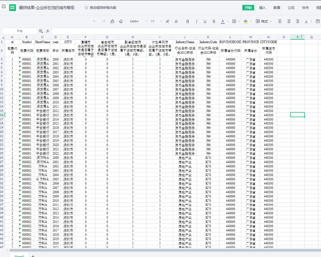 一、包含指标:股票代码 股票代码 股票简称 年份 所属城市 直辖市:企业所在地是否属于直辖市。1是,0否。 副省级城市:企业所在地是否属于副省级城市。1是,0否。 省会城市:企业所在地是否属于省会城市。1是,0否。 计划单列市:企业所在地是否属于计划单列市。1是,0否。 行业名称-证监会2012年版 行业代码-证监会2012年版 所属省份代码 所属省份 所属城市代码