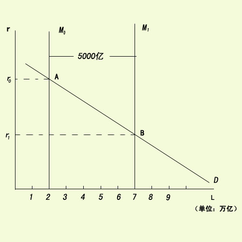 1.央行释放5000亿的流动性,则货币供应增加5000亿元,如下图所示,r为利率,L为货币供应量,M0为初始货币供应量,D则表示货币需求,在央行逆回购操作前,M0与D相交于A点,此时均衡利率为r0,央行在公开市场操作购买5000亿元债券后,货币供应量相对增加5000亿元,从M0移动到M1的位置,此时M1与D相交于B点,与A点相比较,B点处货币供应量增加,均衡利率下降至r1。