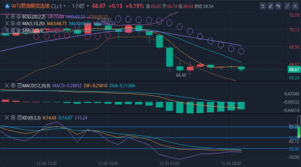 【原油消息面分析】:周三(12月4日)欧盘时段,WTI原油期货连续第三个交易日走高。盘中小幅上涨。欧佩克+预计将把每天220万桶的自愿减产延长至2025年第一季度,这增加了看涨情绪。业内消息人士表示,尽管利比亚的原油日产量达到137万桶,但该联盟仍致力于收紧供应条件。