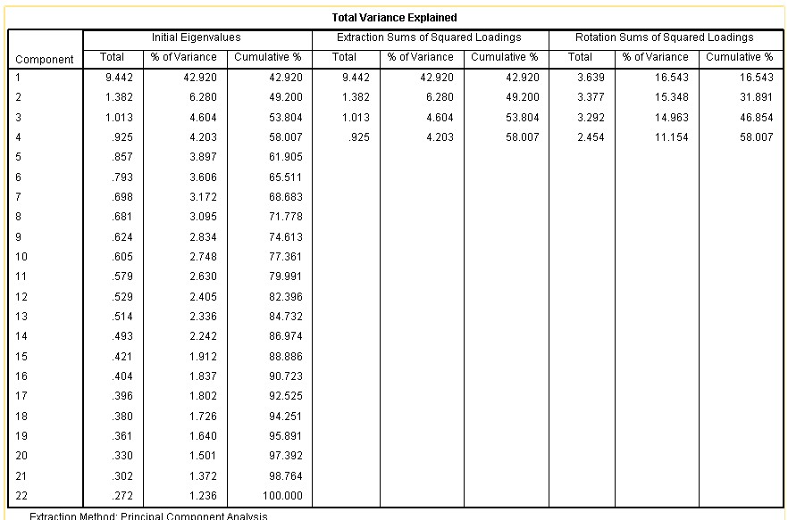谢谢!我也考虑过这个问题,我在删除题项的时候是这样做的:对因子载荷绝对值小于0.4或在多个因子上均有较高载荷(载荷间差值原则上小于0.1)的项目予以删除,并且各个测量项目的共同度一般不小于0.5,否则也可以考虑予以剔除。经过这样的步骤后,因子所含的题项结构清晰,唯一的缺陷是最后一个因子的特征值稍微小于1,累计贡献率偏小。我写的论文是管理学方面的实证,我看过有些学者认为在人文社科领域因子分析累计贡献率一般会偏小,58%应该是可以接受的。不知道我的观点对不对,请指正。