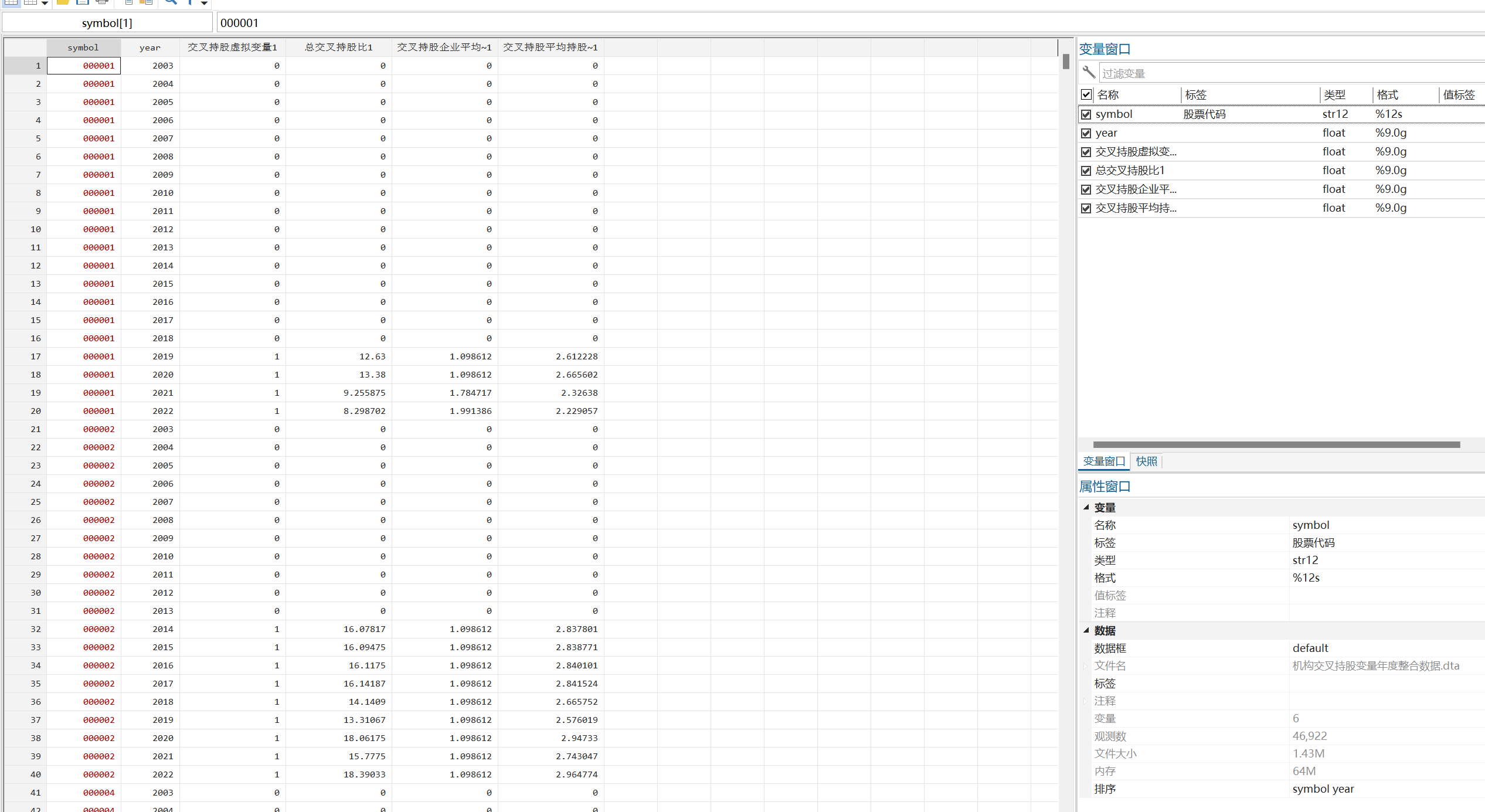 交叉持股虚拟变量:在季度层面,如果机构投资者同时持有本企业及同行业其他企业的股份数量与流通股股数之比大于等于5%,说明该企业存在机构交叉持股,取值为1,否则取0。