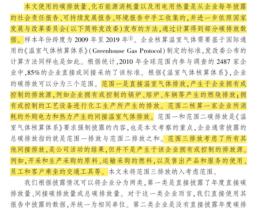 范围三(其他间接温室气体排放):包括企业活动所导致的所有其他间接排放,例如供应链中产生的排放、运输、使用产品等。这个范围没有被纳入本文的考虑范畴。