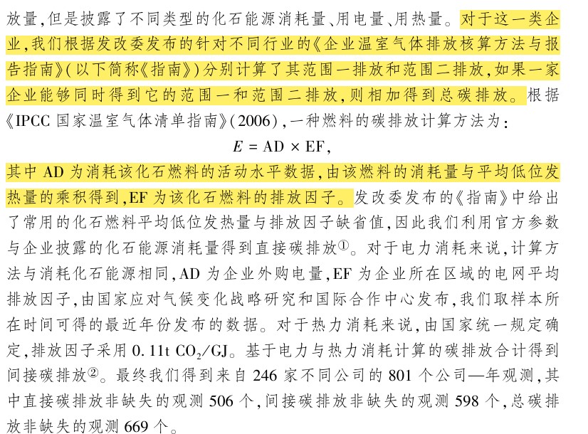 未披露碳排放的企业,对这类企业通过披露的化石能源消耗量、用电量和用热量,结合发改委发布的计算方法和排放因子进行计算,估算出其碳排放。