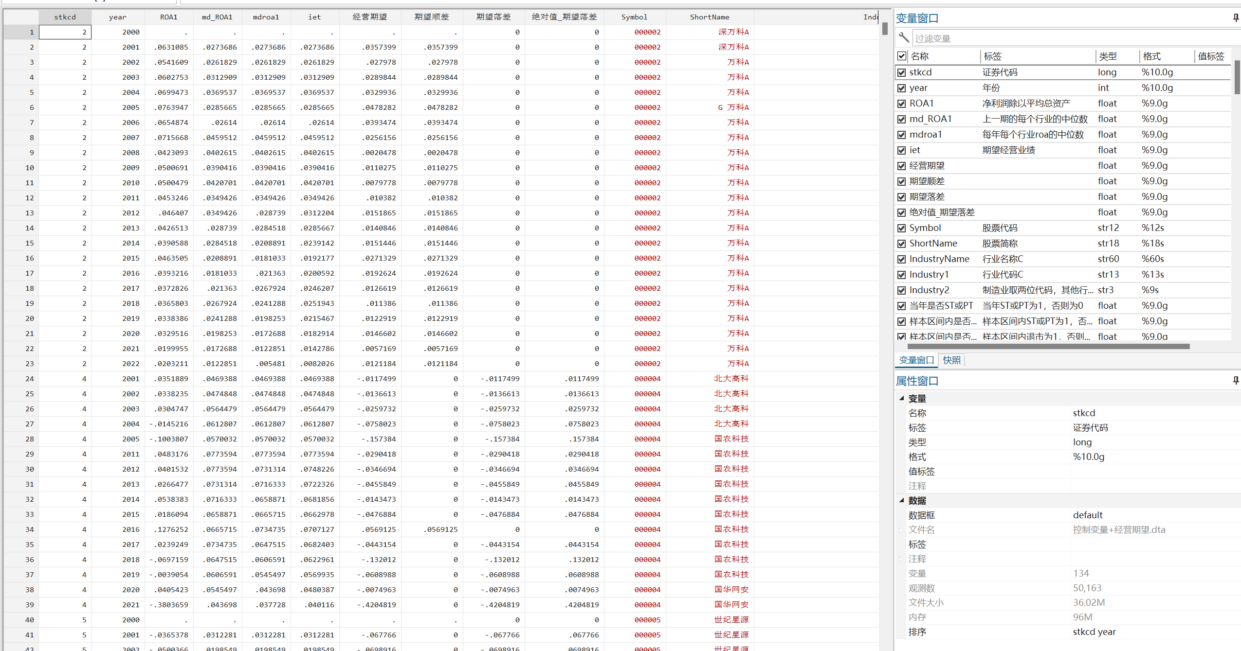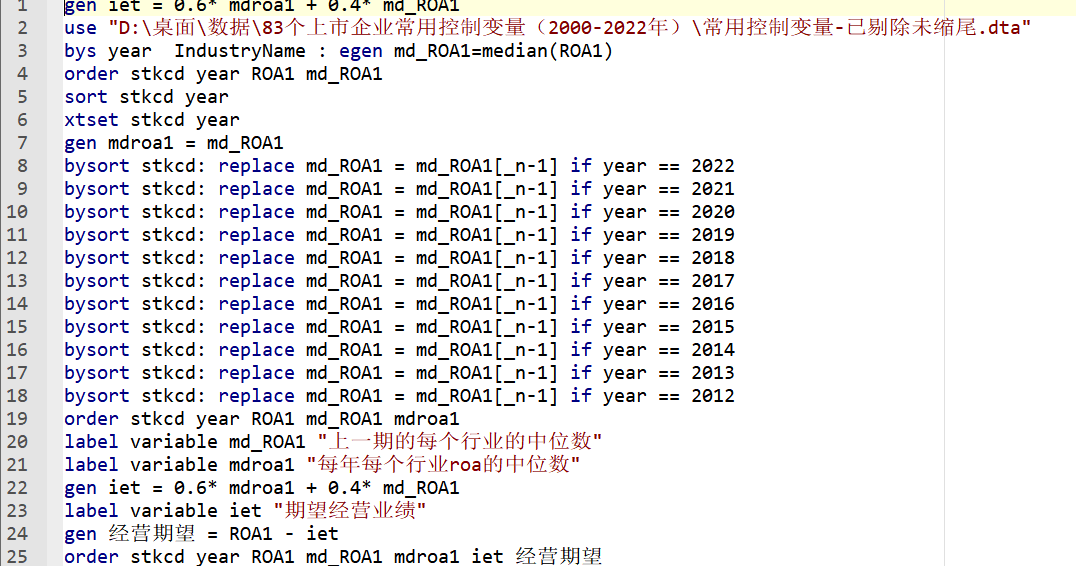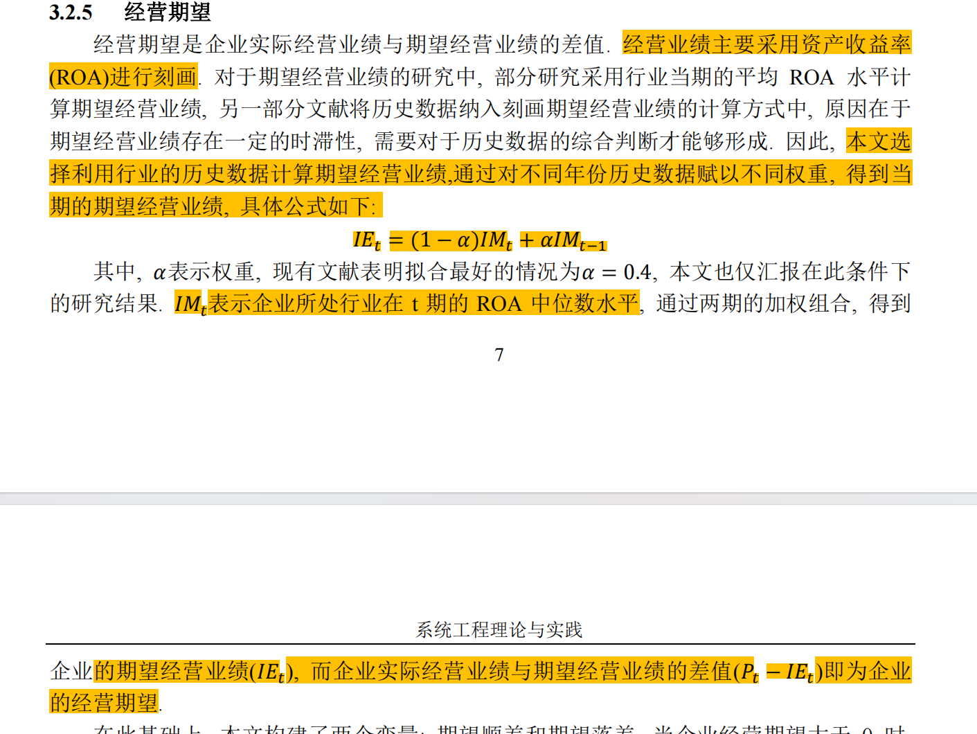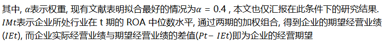 经营期望是企业实际经营业绩与期望经营业绩的差值. 经营业绩主要采用资产收益率(ROA)进行刻画. 对于期望经营业绩的研究中, 部分研究采用行业当期的平均 ROA 水平计算期望经营业绩, 另一部分文献将历史数据纳入刻画期望经营业绩的计算方式中, 原因在于期望经营业绩存在一定的时滞性, 需要对于历史数据的综合判断才能够形成. 因此, 本文选择利用行业的历史数据计算期望经营业绩,通过对不同年份历史数据赋以不同权重, 得到当期的期望经营业绩, 具体公式如下: