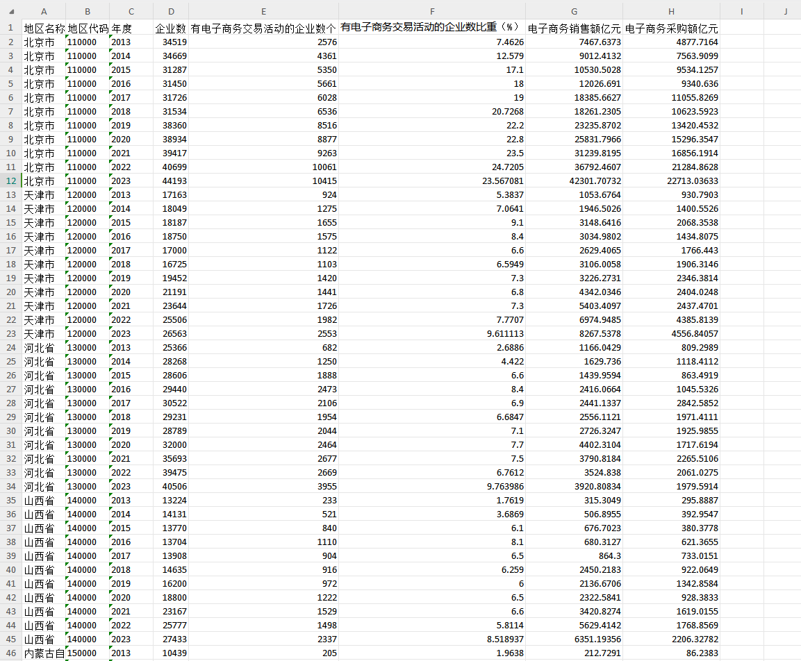 【2023】各省电子商务数据2023-2013年企业数、电子商务销售额、采购额Dta