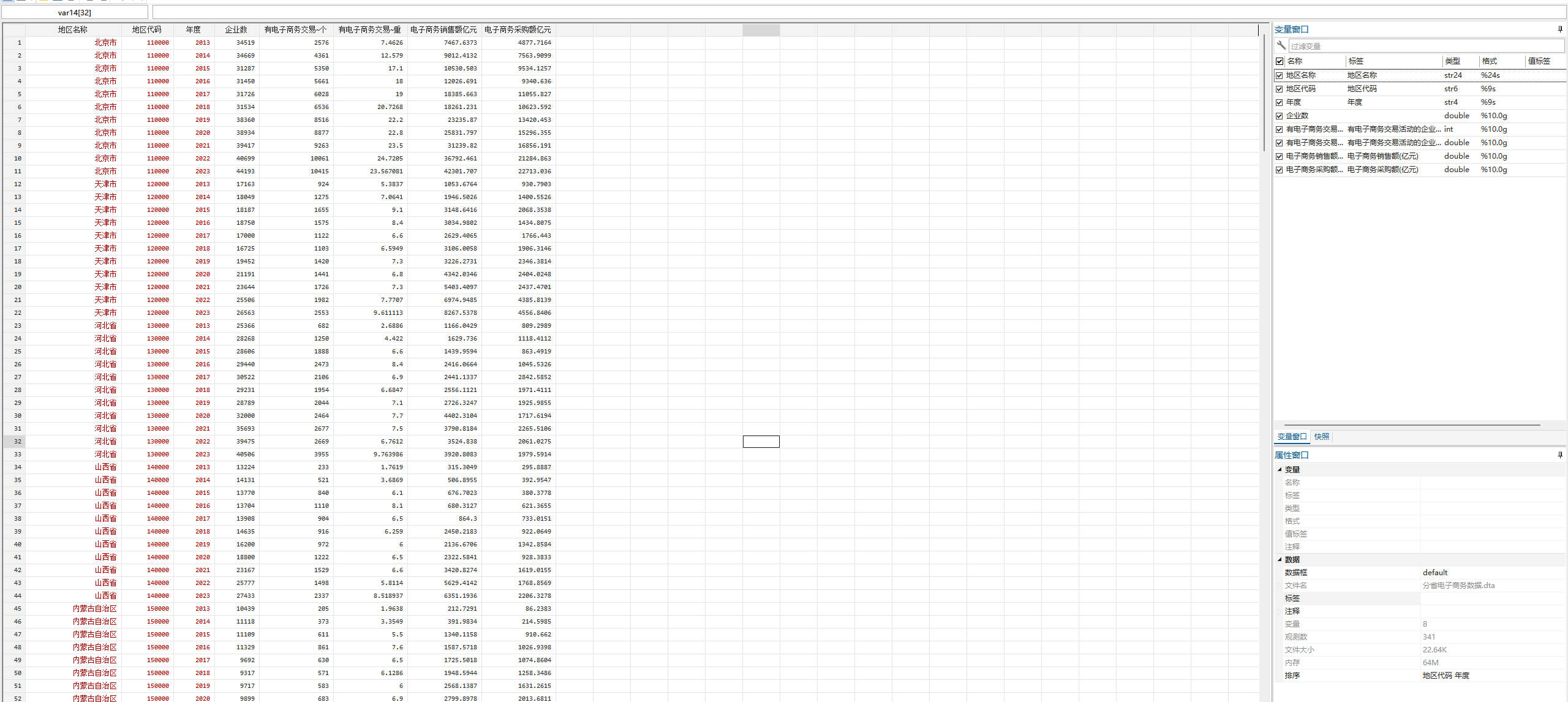 变量字段:企业数(个)、有电子商务交易活动的企业数(个) 、有电子商务交易活动的企业数比重(%)、电子商务销售额(亿元)、电子商务采购额(亿元)