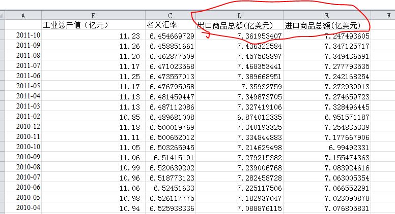 求助大家,能不能用相关软件(excel、spss、eviews)帮我消除一下附件里对数数据里出口商品总额和进口商品总额里的季节因素!!感激不尽!!如果能告诉方法,会感激感激再感激的!