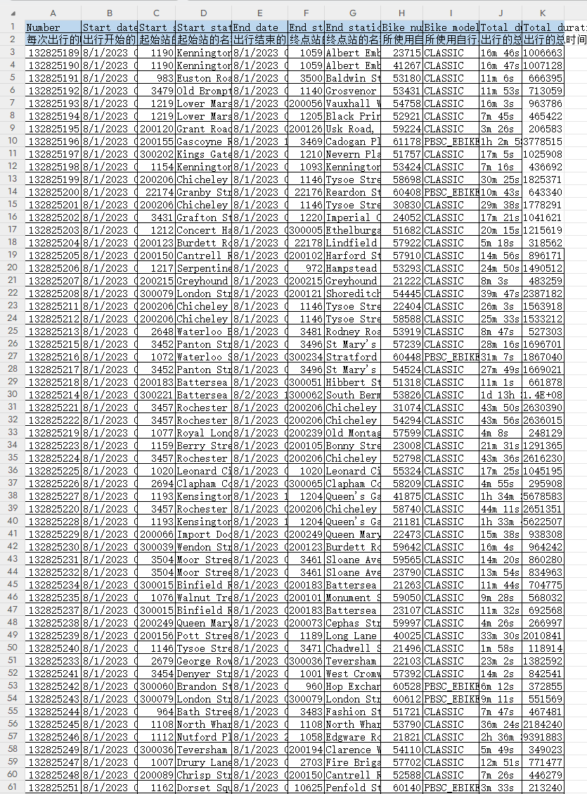 在这个充满活力的国际都市–伦敦,每一辆穿梭于街巷间的共享单车,都是城市流动的血脉,承载着市民与游客的日常出行与探索梦想。现在,让我们一同深入2023年8月1日至8月31日的伦敦共享单车数据集,揭开这座城市的骑行奥秘。