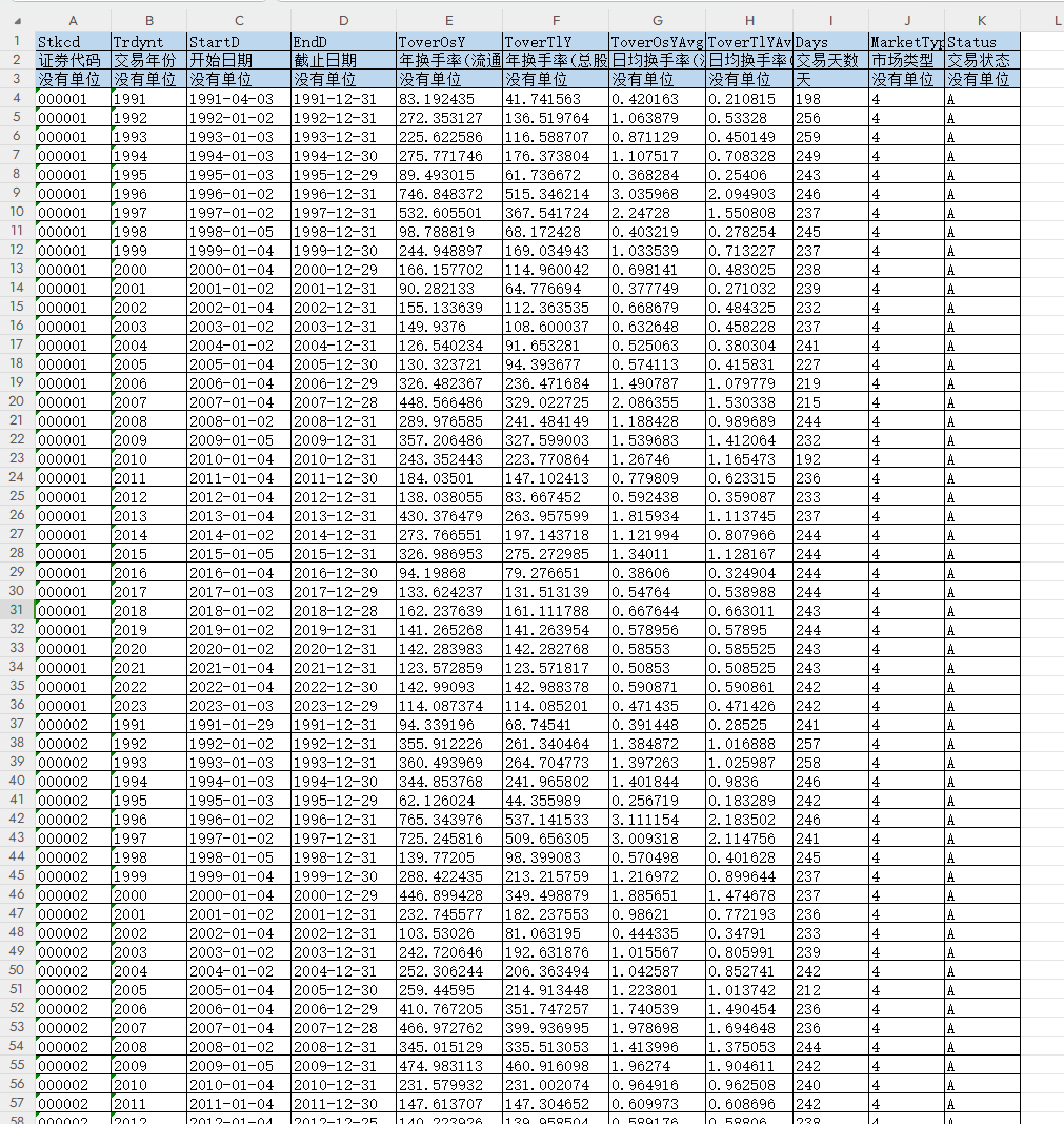 证券代码、交易年份、开始日期、截止日期、年换手率(流通股数)(%)、年换手率(总股数)(%)、日均换手率(流通股数)(%)、日均换手率(总股数)(%)、交易天数、市场类型、交易状态。