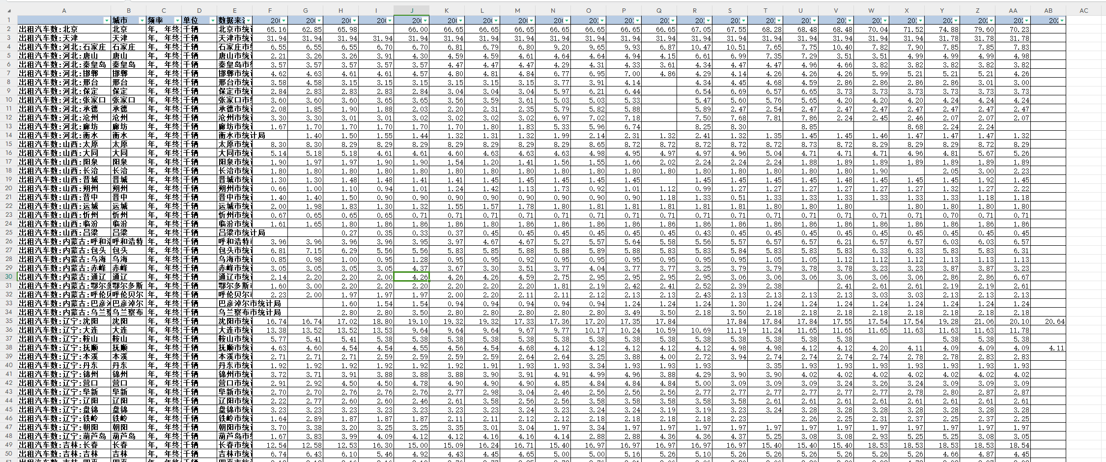 城市、频率、单位、数据来源、公共交通车辆拥有量、出租汽车数、已铺道路面积。