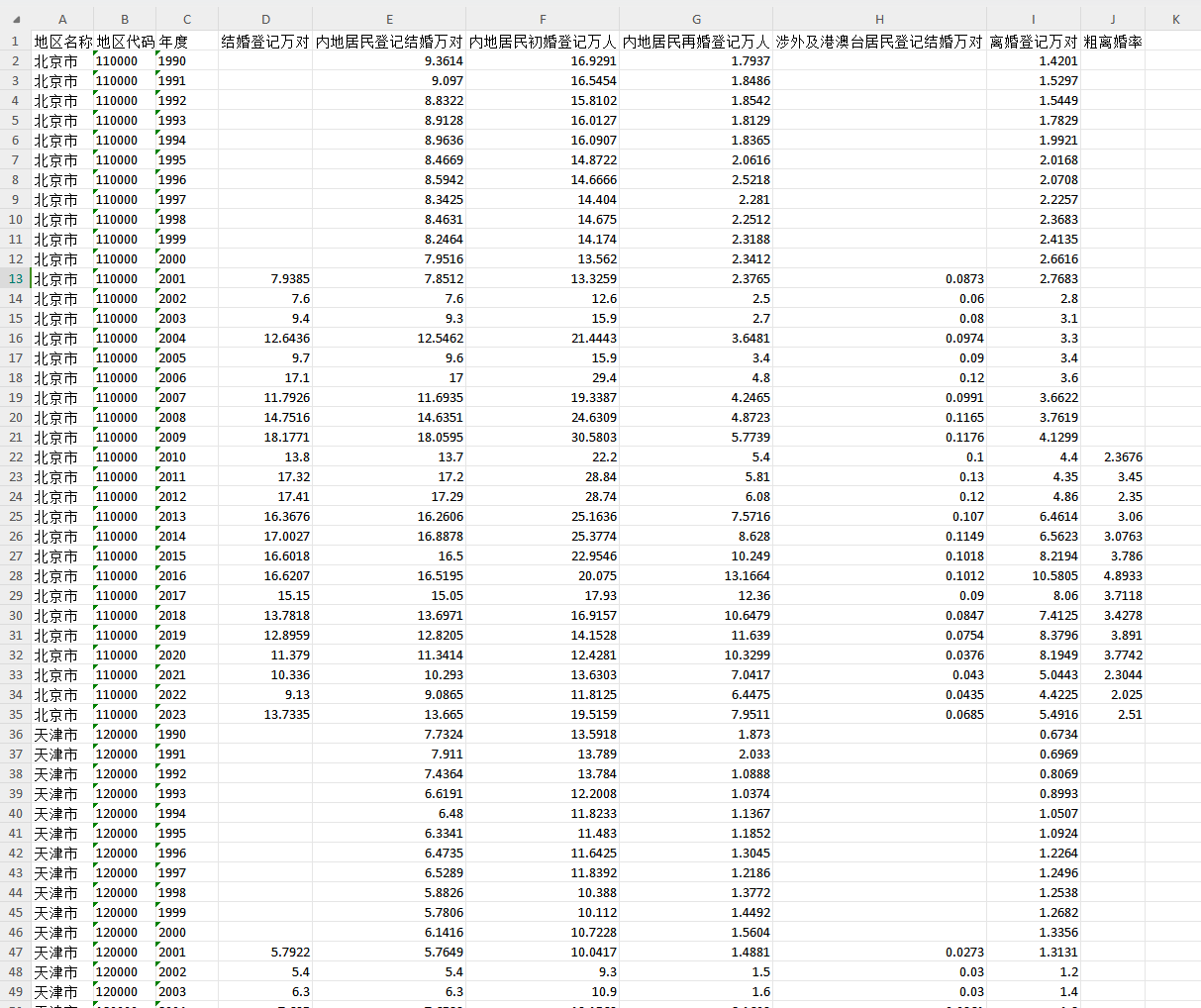 - 变量字段:地区名称、地区代码、年度、结婚登记(万对)、内地居民登记结婚(万对)、内地居民初婚登记(万人)、内地居民再婚登记(万人)、涉外及港澳台居民登记结婚(万对)、离婚登记(万对)、粗离婚率(%)