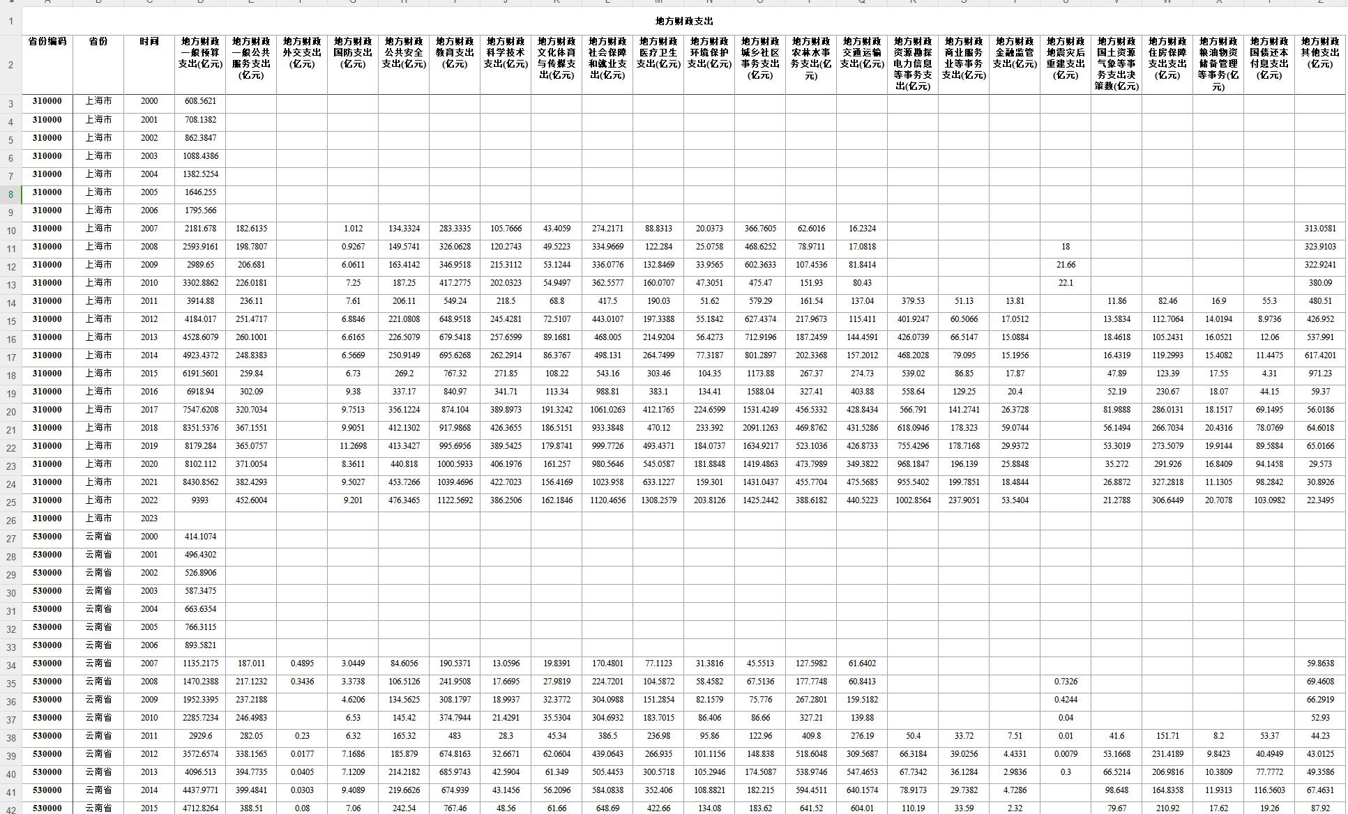 地方财政支出:一般预算支出、地方财政一般公共服务支出、地方财政外交支出、地方财政国防支出、地方财政公共安全支出、地方财政教育支出、地方财政科学技术支出、地方财政文化体育与传媒支出、地方财政社会保障和就业支出、地方财政医疗卫生支出、地方财政环境保护支出、地方财政城乡社区事务支出、地方财政农林水事务支出、地方财政交通运输支出、地方财政资源勘探电力信息等事务支出、地方财政商业服务业等事务支出、地方财政金融监管支出、地方财政地震灾后重建支出、地方财政国土资源气象等事务支出决策数、地方财政住房保障支出支出、地方财政粮油物资储备管理等事务、地方财政国债还本付息支出、地方财政其他支出。