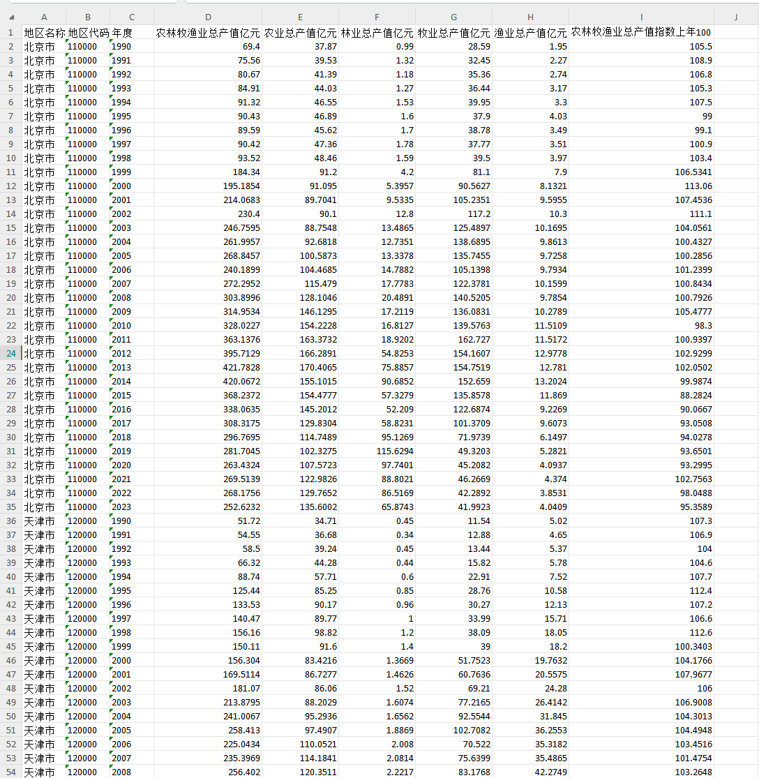 - 变量字段:地区名称、地区代码、年度、农林牧渔业总产值(亿元)、农业总产值(亿元)、林业总产值(亿元)、牧业总产值(亿元)、渔业总产值(亿元)、农林牧渔业总产值指数(上年=100)