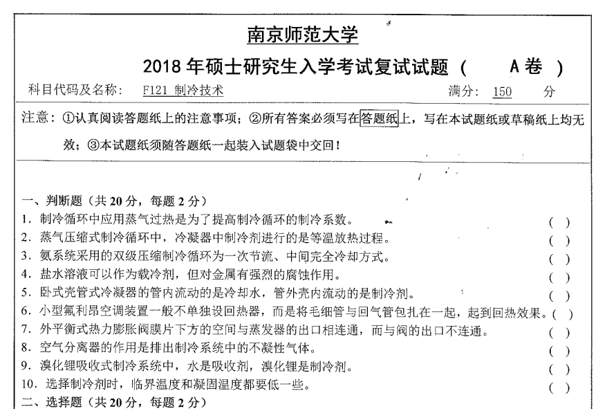2018制冷技术南师大南京师范大学考研复试真题(无答案)