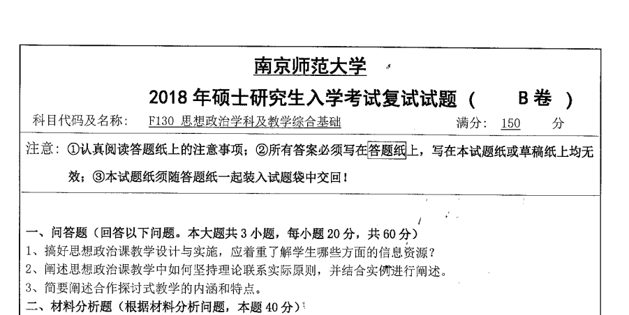 2018思想政治学科及教学综合基础南师大南京师范大学考研复试真题(无答案)