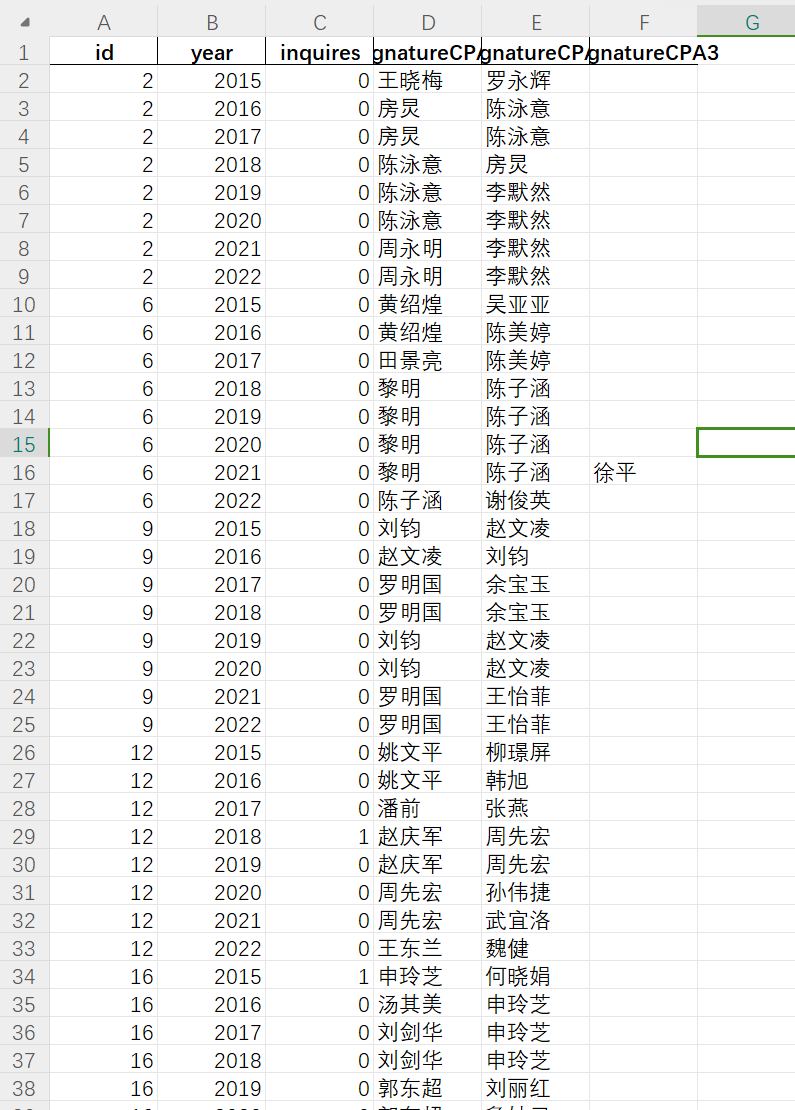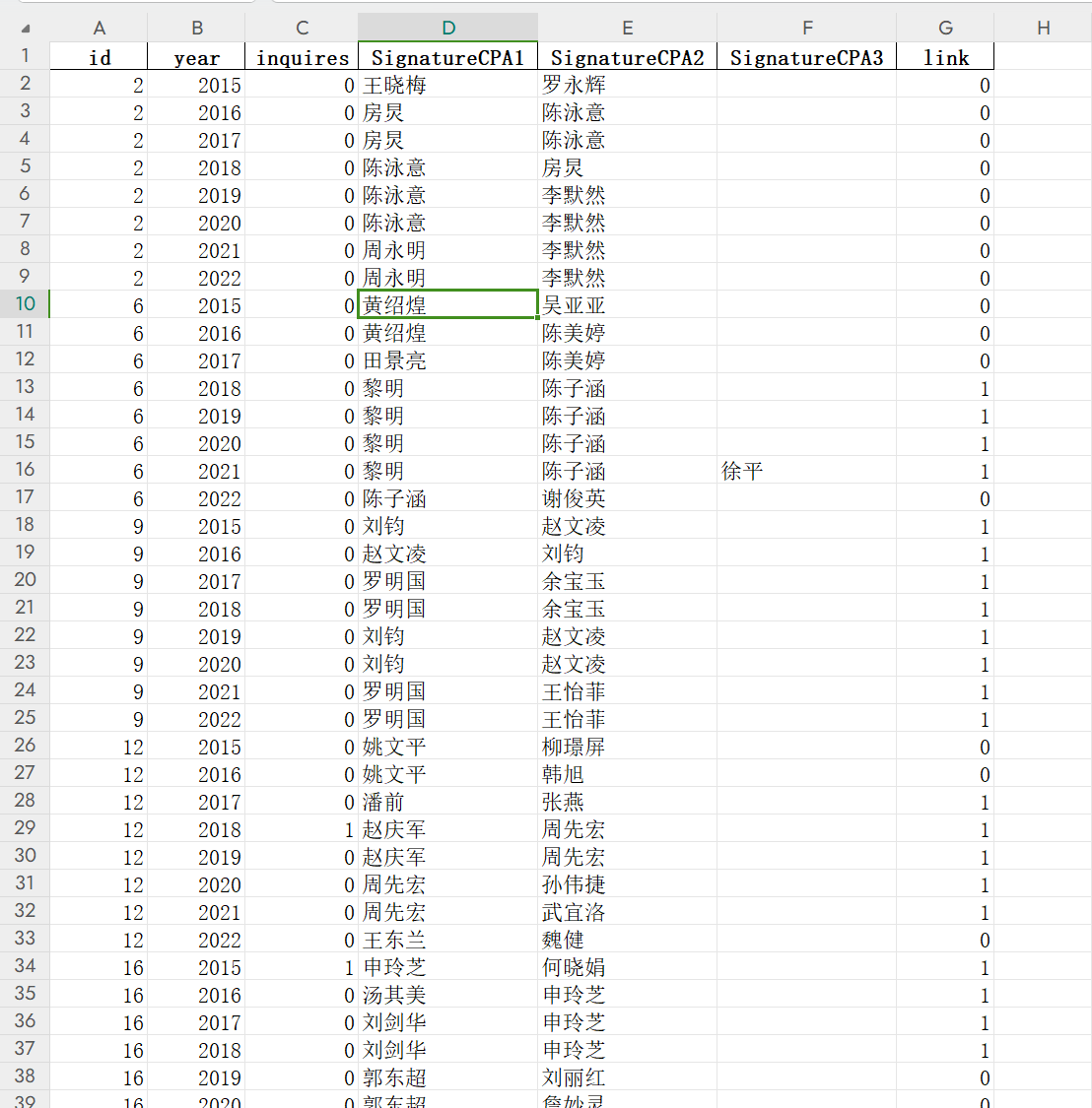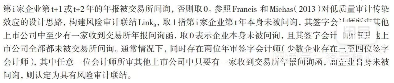 第i家企业第t+1或t+2年的年报被交易所问询,否则取0。参照Francis和Michas(2013)对低质量审计传染效应的设计思路,构建风险审计联结Linki,取1指第i家企业第t年本身未被问询,其签字会计师版中其他上市公司中至少有一家收到交易所年报问询函,取0表示企业本身未被问询,且其签字会计币所其也上市公司全部都未被交易所问询。通常情况下,同时存在两位年审签字会计师(少数企业存在三至四位签字会计师),其中任意一位会计师所审其他上市公司中只要有一家收到交易所年报问询函,前年业咨身未被问询,则认定为具有风险审计联结。