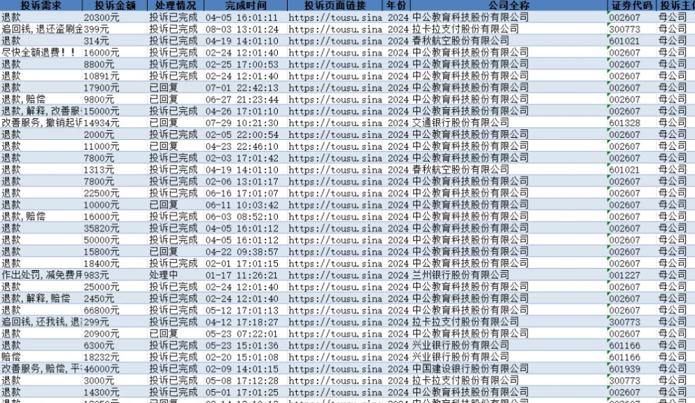 个人-企业、投诉标题、投诉事由、处理情况、投诉编号、服务需求、投诉时间、投诉需求、完成时间、投诉对象、投诉金额、投诉页面链接