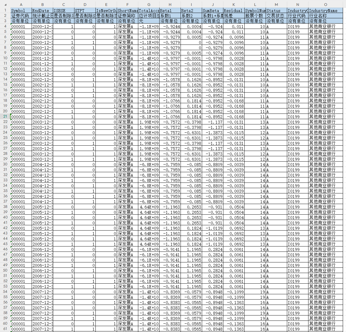 证券代码 统计截止日期 是否剔除北交所上市公司 是否剔除ST或*ST、PT类公司 是否剔除当年新上市,已经退市或被暂停上市的公司 证券简称 应计项目总额 系数1 系数2 系数1+系数2 残差 股票个数 交易状态 行业代码 行业名称