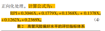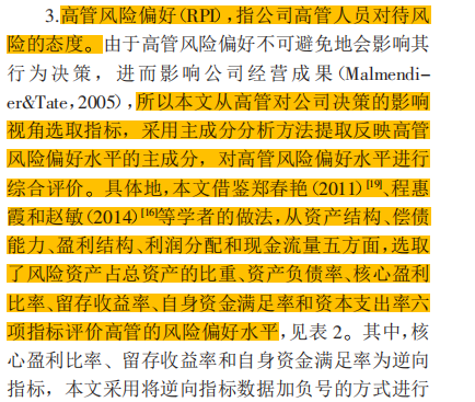 高管风险偏好指公司高管人员对待风险的态度。由于高管风险偏好不可避免地会影响其行为决策,进而影响公司经营成果,所以从高管对公司决策的影响视角选取指标,采用主成分分析方法提取反映高管风险偏好水平的主成分,对高管风险偏好水平进行综合评价。具体地,从资产结构、偿债能力、盈利结构、利润分配和现金流量五方面,选取了风险资产占总资产的比重、资产负债率、核心盈利比率、留存收益率、自身资金满足率和资本支出率六项指标评价高管的风险偏好水平,其中,核心盈利比率、留存收益率和自身资金满足率为逆向指标,本文采用将逆向指标数据加负号的方式进行正向化处理。https://bbs.pinggu.org/thread-10771156-1-1.html