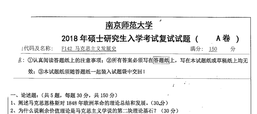 2018马克思主义发展史南师大南京师范大学考研复试真题(无答案)