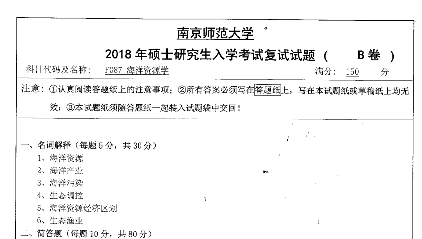2018海洋资源学南师大南京师范大学考研复试真题(无答案).pdf