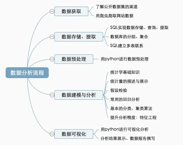 一般而言,可以按照“数据获取-数据存储与提取-数据预处理-数据建模与分析-数据可视化”这样的步骤来实施一个数据分析项目,这时我们需要掌握一些主要细分知识点。