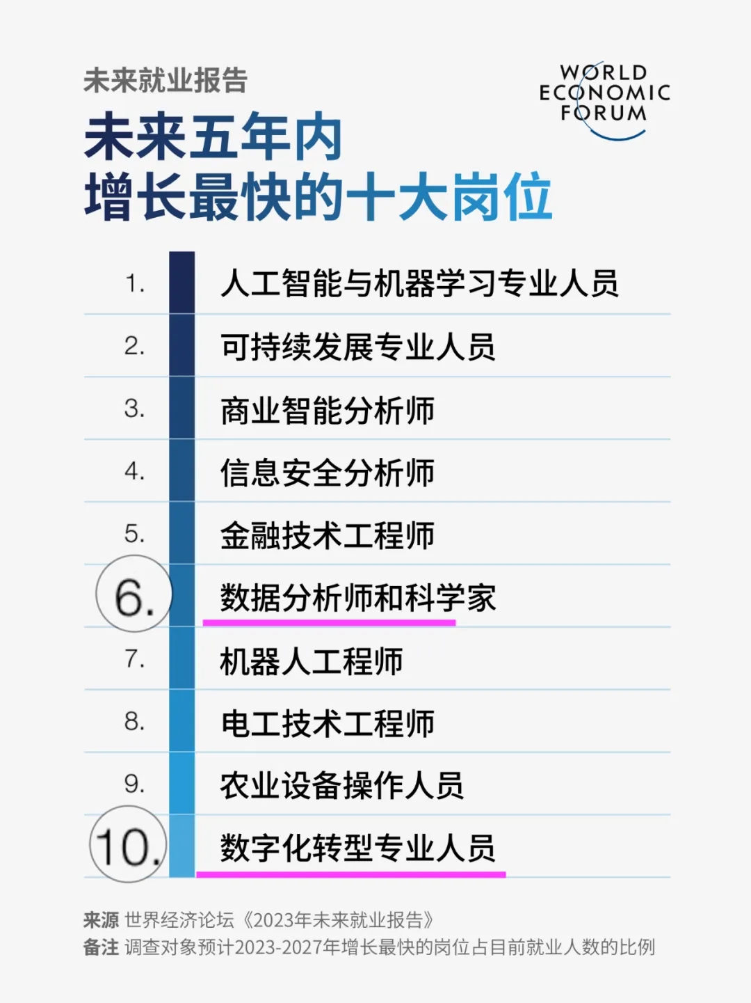 2023世界经济论坛发布的《未来就业报告》,预测了未来五年内增长最快的十大岗位,其中就包括了人工智能与机器学习专业人员、数据分析师和科学家和数字化转型人员。