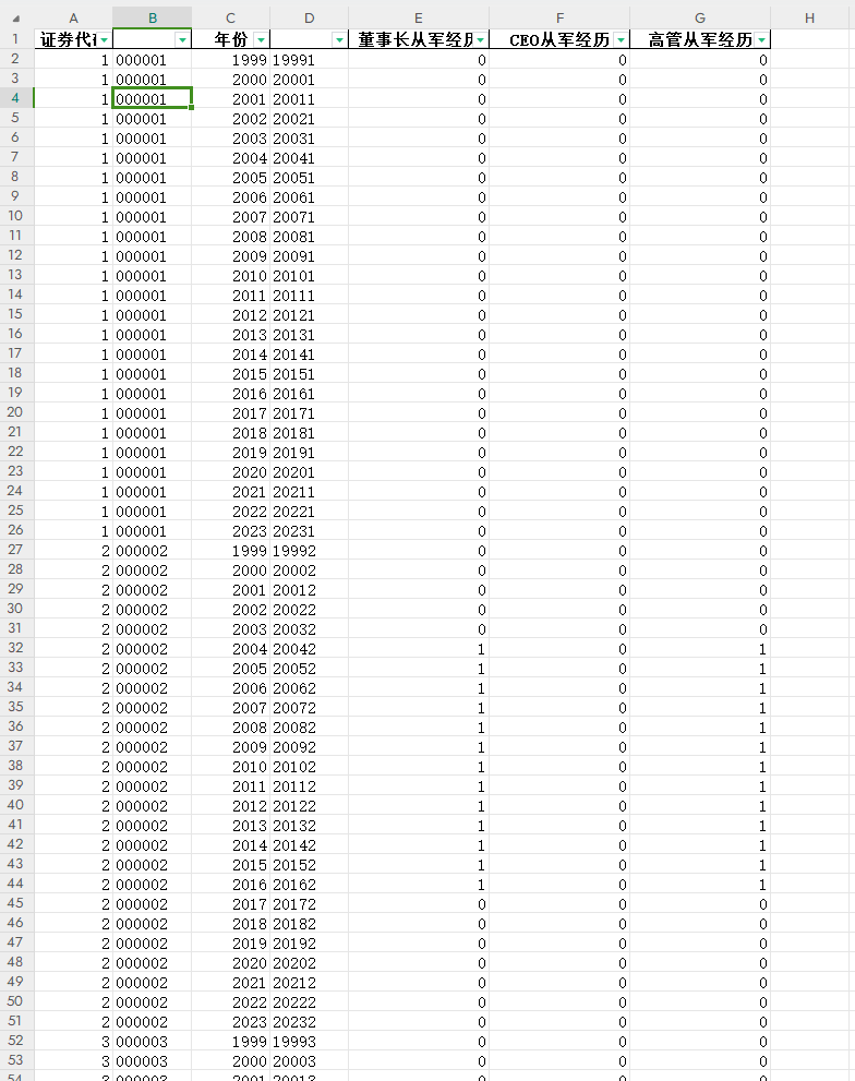 大家好,本数据集1999-2023上市公司高管从军经历、董事长从军经历、CEO从军经历数据大合集,3大权威测度指标!包括上市公司高管职务类别、具体职务、教育背景、职称、高管个人简历等原始数据,以及参考权威C刊文献做法构建的董事长从军经历、CEO从军经历、高管从军经历的3大权威测度指标,累计涵盖6.3w+观测值数量,5600+样本企业,已整理好的面板数据格式可直接用于回归分析,欢迎关注!