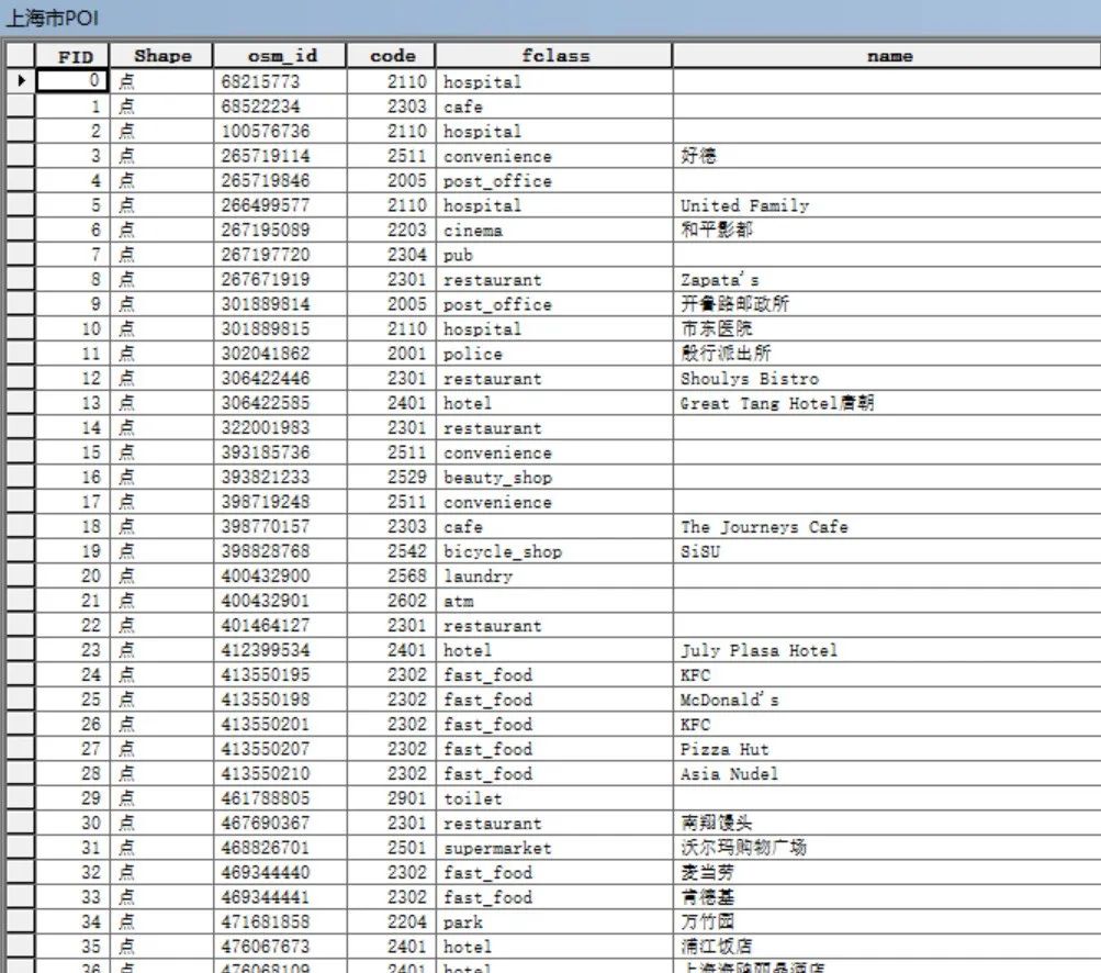 其中,字段‘fclass’表示的是POI点的类型,一共有118种具体类型,比如快餐店、医院、超市、咖啡店、饭店等。字段‘name’表示的是POI设施的名字,这个字段数据缺失很多!