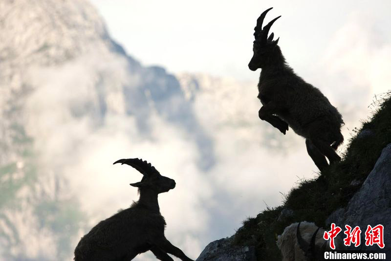 摄影师MARIUS SABO拍摄到了两只勇敢的山羊在意大利山峰上上演龙争虎斗的情景。这两只山羊居然站在13000多英尺的山峰上,在一块岩石附近展开了激烈的交战,如果一不留神,随时会有从山峰跌落粉身碎骨的危险。而更人惊奇的是,在这两只山羊附近竟然还潜伏着一只山羊,看上去像是在为两只山羊的争斗充当裁判一样。图片来源:东方IC