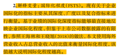 国际化程度(FSTS)。现有关于企业国际化的指标主要从其深度、广度以及复合指标来进行衡量。基于业绩的国际化深度指标能够最直接地反映企业国际化程度,但鉴于上市公司数据披露的有限性,参照王海林和王晓旭(2018)的做法,本文使用海外营业收人占总营业收人的比值来衡量国际化程度,该值越大说明国际化程度越高。