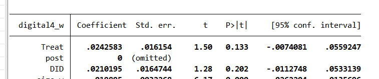 7bfdc63f5d371ae3d61b290a4a959e9.png 87d381c75ef0b0bda6fcb52e0460002.png 上面是我参考文献中的,为什么参考文献模型结果出来有post的系数,我的post显示omit被删除了,我的运行代码和运行结果在下面,各位大佬帮忙看看是哪里出现了问题?