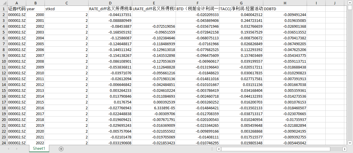 证券代码 year stkcd RATE_diff名义所得税率减去实际所得税率的差额 LRATE_diff名义所得税率与实际税率之差”的五年平均值 BTD(税前会计利润一应纳税所得额)/期末总资产 TACC(净利润-经营活动产生的现金流量净额)/资产总计 DDBTD
