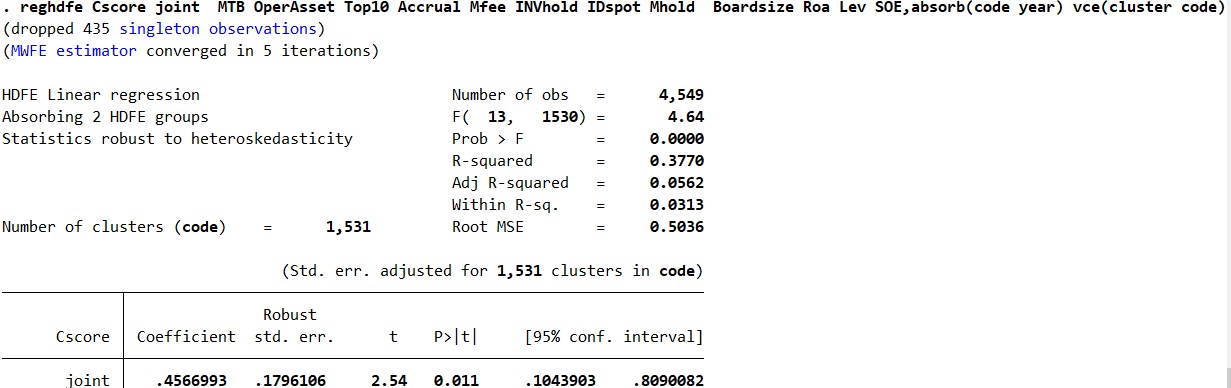 2. **控制变量**:检查是否在所有命令中都包含了相同的控制变量。有时某些回归命令默认包括某些类型的控制变量(如固定效应),而其他命令则需要显式指定这些选项。