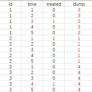 面板数据中已经有id、time、treated变量,如何生成一个新的变量,这个变量的赋值为treated=1时time变量的值,想要的效果如下图红色部分所示,谢谢了!