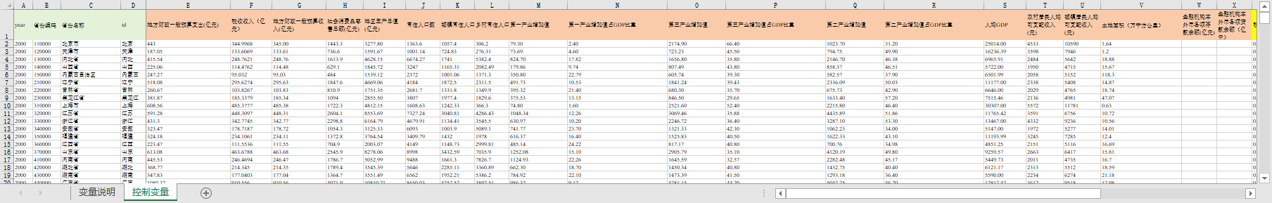 year 省份编码 省份名称 id 地方财政一般预算支出(亿元) 税收收入(亿元) 地方财政一般预算收入(亿元) 社会消费品零售总额(亿元) 地区生产总值(亿元) 常住人口数 城镇常住人口数 乡村常住人口数 第一产业增加值 第一产业增加值占GDP比重 第三产业增加值 第三产业增加值占GDP比重 第二产业增加值 第二产业增加值占GDP比重 人均GDP 农村居民人均可支配收入(元) 城镇居民人均可支配收入(元) 土地面积(万平方公里) 金融机构本外币各项存款余额(亿元) 金融机构本外币各项贷款余额(亿元) 税负水平 财政支持力度 经济发展水平 社会消费水平 产业结构 城镇化率 产业结构高级化 产业结构高度化 城乡居民收入差距 人口密度(人/平方公里) 金融机构贷款余额占GDP的比重 金融机构存贷款之和占GDP的比重