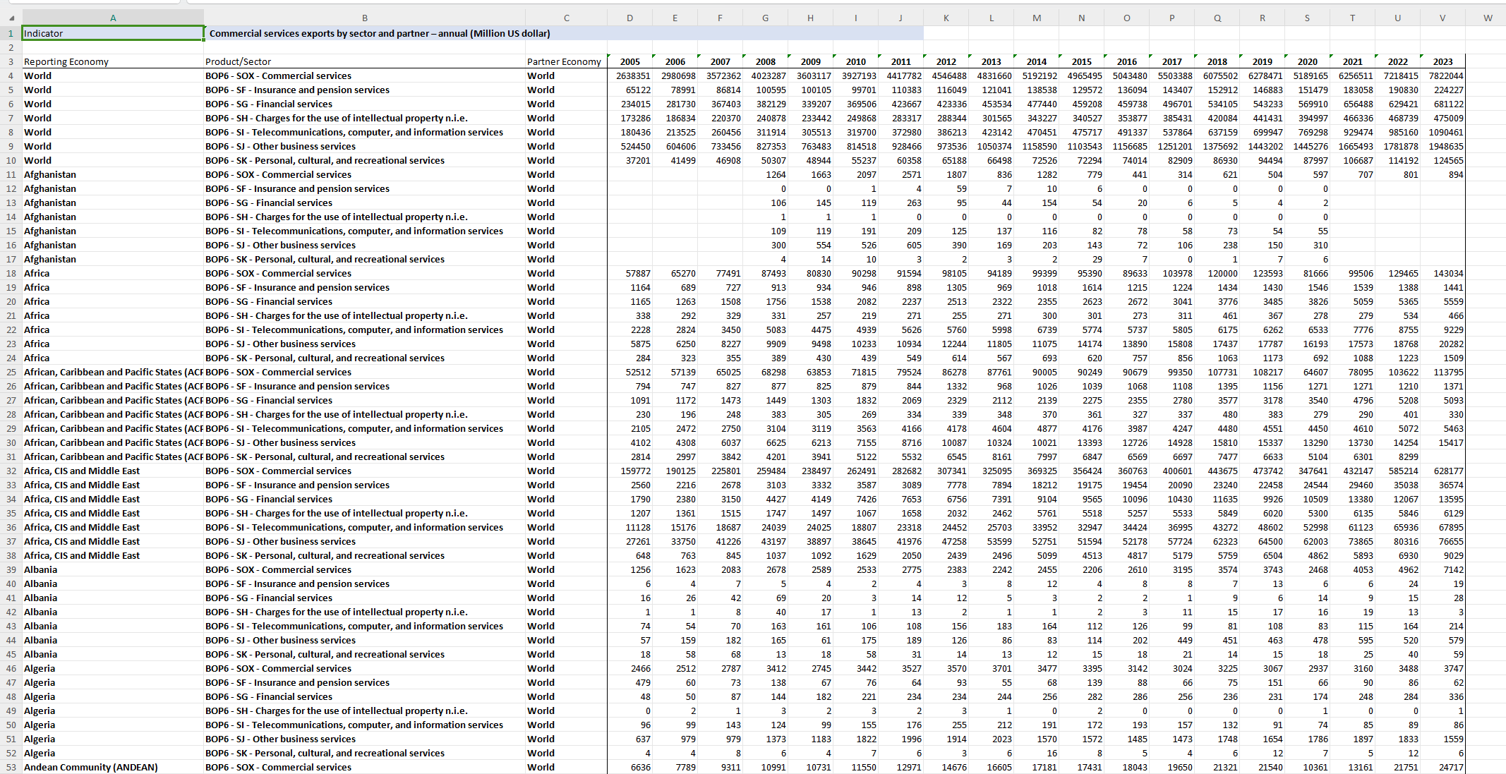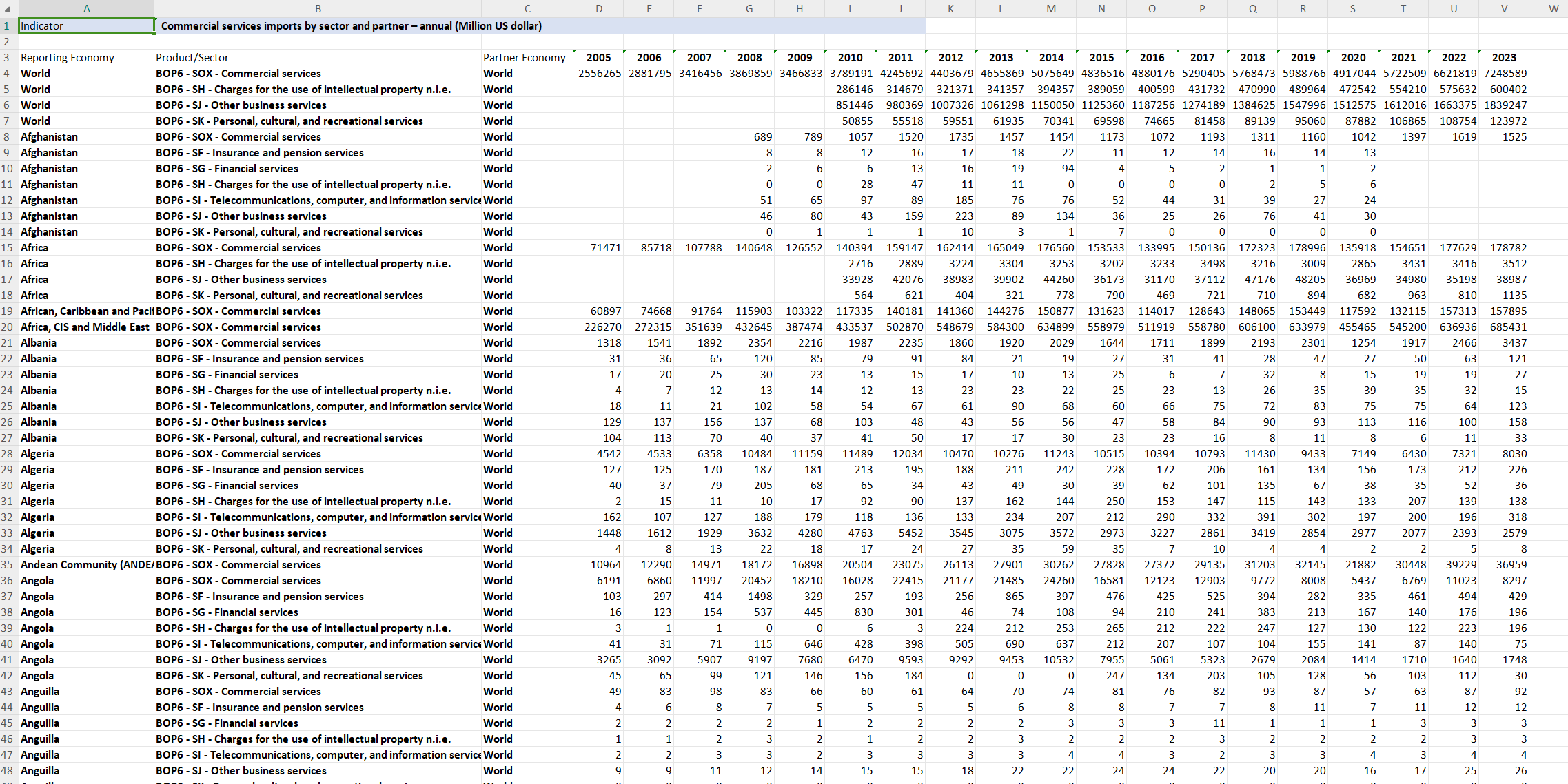 数据名称:2005-2023年世界各国(200+)数字服务贸易进出口数据(6大细分行业数据)