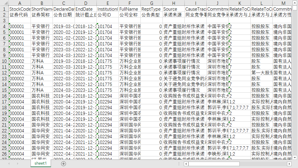 证券代码 证券简称 公告日期 统计截止日期 公司ID 公司全称 公告类型 承诺来源 同业竞争事件成因追溯 同业竞争承诺方 承诺方与上市公司关系编码 承诺方与上市公司关系明细 承诺方性质 承诺类型 同业竞争对手方 对手方与上市公司的关系 承诺内容及解决措施 承诺时间 承诺期限 履行情况 履行情况详细说明 事件解决日期 承诺是否发生过变更