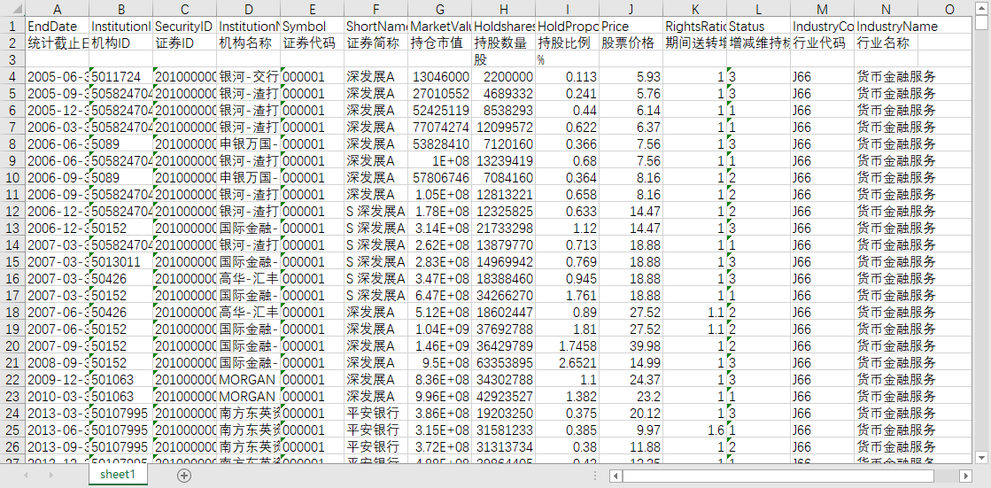 统计截止日期 机构ID 证券ID 机构名称 证券代码 证券简称 持仓市值 持股数量 持股比例 股票价格 期间送转增配股比例 增减维持标识 行业代码 行业名称